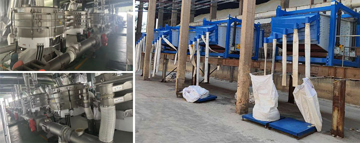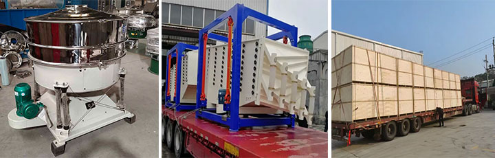 方形摇摆筛从外观看像一个横放的长方体,它的筛网可以5-8°的倾斜安装,因此筛分的产量更大,通常在9-60吨/小时,可以进行玻璃粉的大产量连续化生产。圆形摇摆筛的外观像一个圆柱体,它的占地面积比方形摇摆筛小,圆形机型的筛分目数在20-700目左右, 可以实现1公斤/小时 - 50吨/小时的玻璃粉生产。以下左边是方形摇摆筛,右边的图片是圆形摇摆筛。